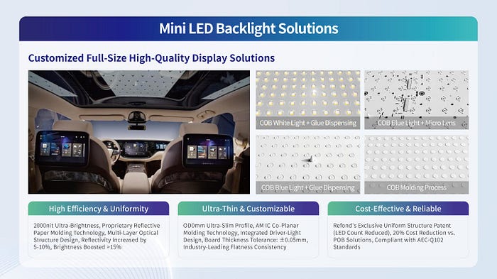 In the field of Mini LED automotive backlighting, Refond primarily adopts the COB (Chip on Board) technology route, continuously advancing process iteration and integrated driver design. Leveraging ultra-thin OD0mm designs, innovative 3D optical structures, and enhanced white-light solutions, Refond enables thinner, lighter backlight modules with superior color performance and brightness uniformity — building strong product competitiveness through technological differentiation.
