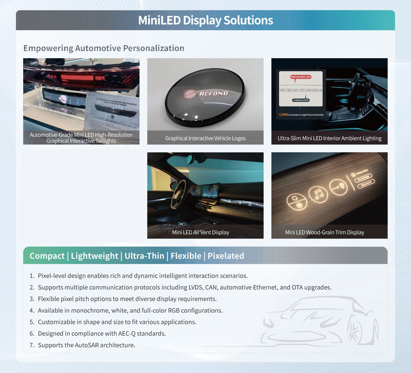 Notably, Refond is also actively expanding the innovative applications of Mini LED direct display technology in the automotive field, extending from in-cabin to exterior interaction and safety systems. Its product lineup now includes intelligent interior surfaces, ultra-thin ambient lighting, pixelated smart tail lights, and dynamic illuminated logos, advancing Mini LED toward smaller, lighter, thinner, more flexible, and more pixelated designs — providing strong technological support for the next generation of smart cockpit and exterior interaction upgrades.